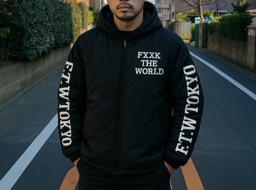 胸元には「FXXK THE WORLD」、両袖には存在感抜群の F.T.W TOKYO ロゴ を大胆にレイアウト。